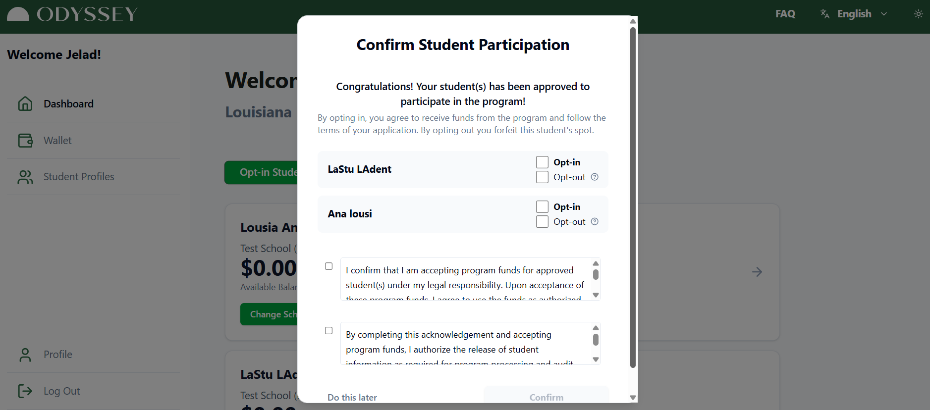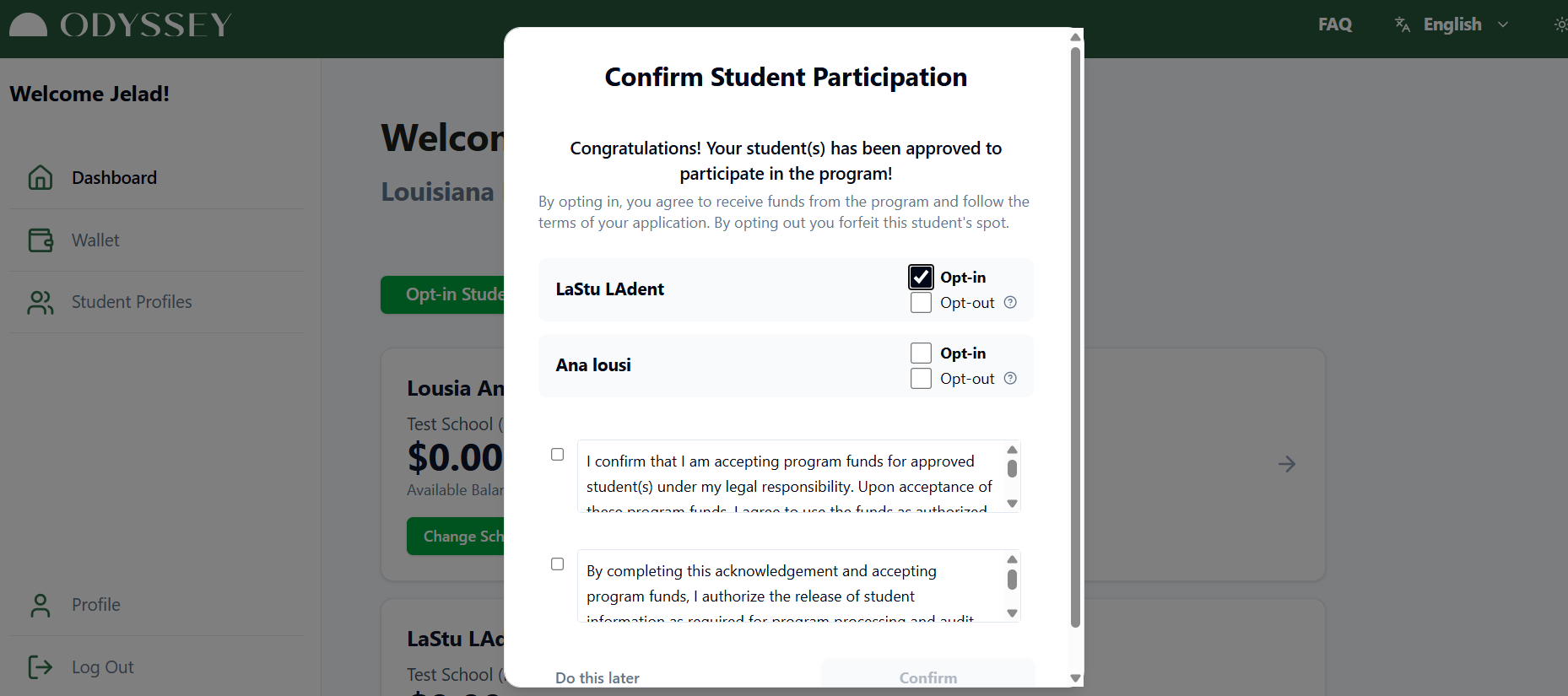 You will see a pop-up titled Confirm Student Participation. This is where you'll confirm your participation and begin the student selection process. Please note that opting in must be completed separately for each student. If you have more than one student approved, you will need to opt in for each one individually.