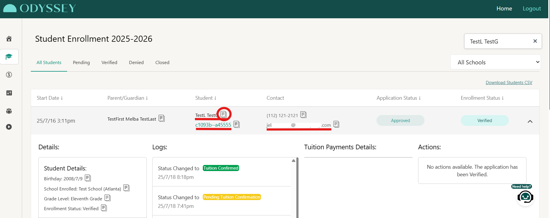 - Copy the student name, enrollment ID, and parent email by clicking on the paper icon next to each.