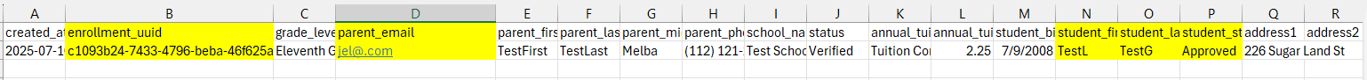 - Once you have the CSV, search for and copy the enrollment ID, parent email, and student name.
