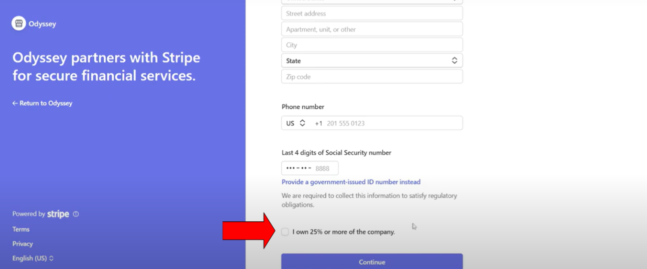 - Click the checkbox if you own 25% of more of the business. If not, leave the checkbox blank.