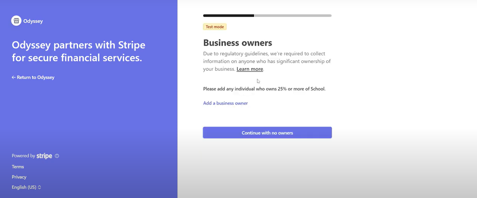 - Provide information on the business owners. Alternatively, you can opt to continue without providing this information by clicking [Continue with no owners].